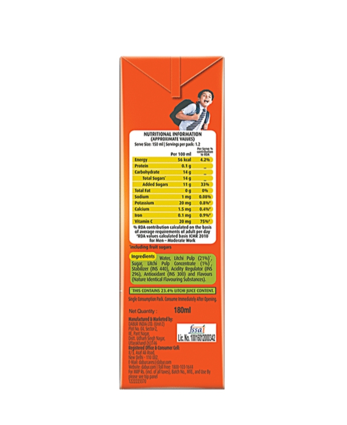 Ingredients ( Water, Litchi Pulp (23.1), Sugar (12 G), Stabilizer (Ins 440), Acidity Regulator (Ins 296), Antioxidants (Ins 300).Contains Added Nature Identical Litchi Flavour.No Added Colour Or Preservatives.